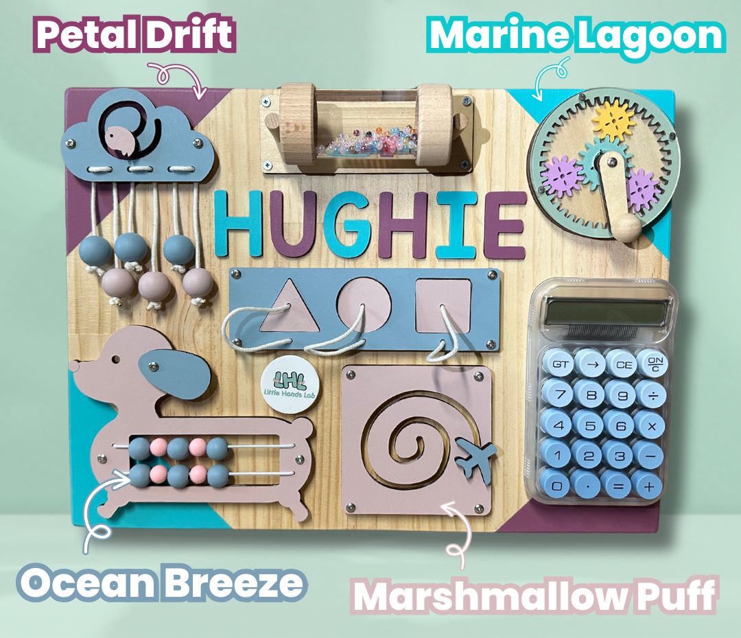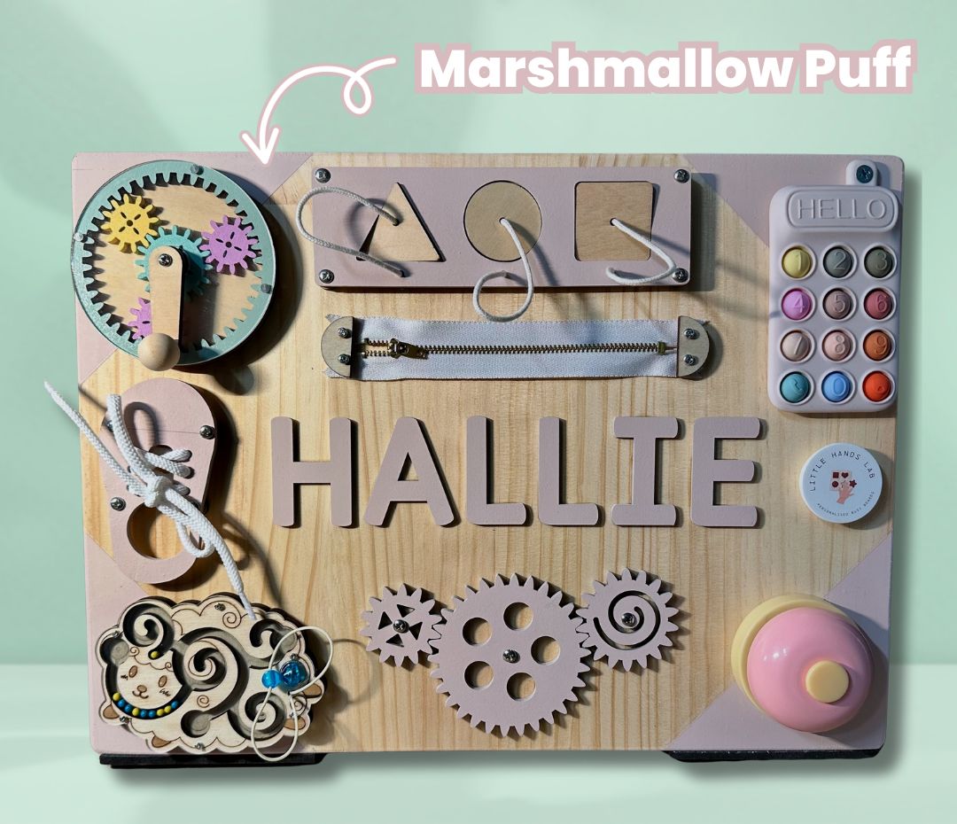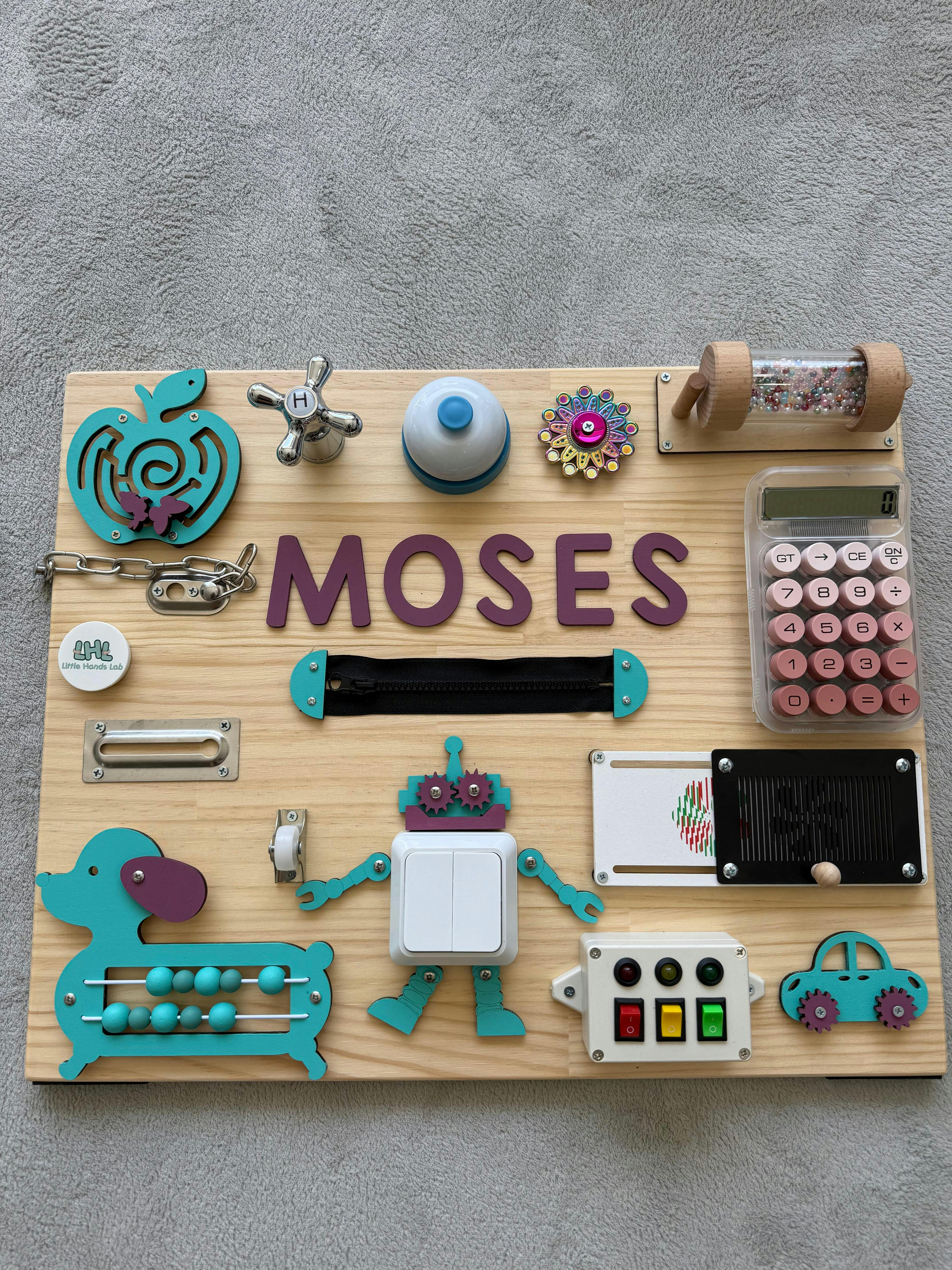 Playtime just got personal. Crafted with care and made just for your little one, this custom busy board encourages hands-on learning, creativity, and problem-solving.